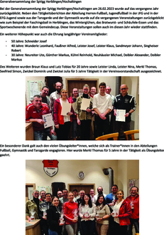 Bei der Generalversammlung der SpVgg Herblingen/Hochaltingen am 26.02.2023 wurde auf das vergangene Jahr zurückgeblickt. Neben den Tätigkeitsberichten der Abteilung Herren-Fußball, Jugendfußball in der JFG und in der EFG-Jugend sowie aus der Tanzgarde und der Gymnastik wurde auf die vergangenen Veranstaltungen zurückgeblickt wie zum Beispiel der Faschingsball in Herblingen, das Winterglühen, das Bratwurst- und Schäufele-Essen und das Sportwochenende mit dem Gemeindecup. Diese Veranstaltungen sollen auch im diesen Jahr wieder stattfinden.