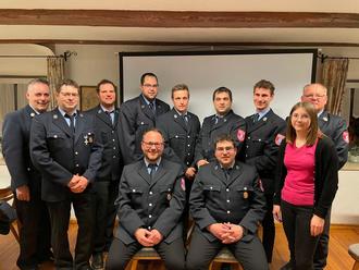 Von links stehend: KBM Klaus Schwager, Marco Roder, Daniel Fuchs, Tobias Fälschle, Andreas Förg, Dominic Förch, Simon Uhl, Bernd Eberle, Franziska Singheiser Von links sitzend. 1. Vorstand Dominik Vogelsang, 1. Kommandant Michael Förg