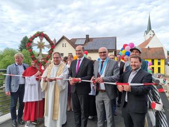 Pfarrer Urban spendete der Brücke den kirchlichen Segen. Dann versammelten sich alle Amtsträger an der Brücke und schnitten gemeinsam das symbolische Band durch, während Kinder Luftballone steigen ließen. Pfarrer Urban weihte die Brücke, bevor alle gemeinsam zum Marktplatz zogen.