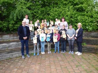 Stolz präsentieren die Kinder, die die Mittagsbetreuung an der Dr.-von-Ringseis-Grundschule Schwarzhofen besuchen, ihre gebastelten Nistkästen. Sie haben diese mit Unterstützung ihrer Betreuerinnen an mehreren Nachmittagen jeweils nach der Hausaufgabenzeit gebastelt und bemalt.