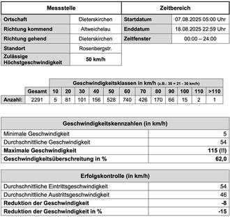 Anhand der Ergebnisse ist klar ersichtlich, dass ein erhöhtes Verkehrsaufkommen auf der Rosenbergstraße in Dieterskirchen stattfindet und dies leider auch zum Großteil mit stark erhöhter Geschwindigkeit! Hiermit appelliert die Gemeinde Dieterskirchen an die Vernunft der Bürger, sich an die 50km/h Beschränkung innerorts zu halten.