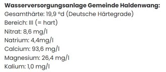 Die Gesamthärte des untersuchten Trinkwassers liegt bei ca. 19,9° d (Deutsche Härtegrade) und ist somit als hartes Wasser (Härtebereich III) einzustufen (Trinkwasseranalyse Stand: September 2024).