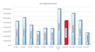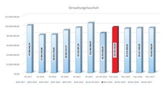 Der Haushalt 2024 wurde am 15.10.2024 vom Gemeinderat verabschiedet. Dieser sieht im Verwaltungshaushalt Einnahmen und Ausgaben in Höhe von jeweils 9.578.100 € (Vorjahr: 8.354.873 €) und im Vermögenshaushalt Einnahmen und Ausgaben in Höhe von jeweils 5.242.100 € (Vorjahr: 7.818.300) vor. Der Gesamthaushalt beläuft sich somit auf insgesamt 14.820.200 € (Vorjahr: 16.172.300€).