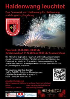 An Silvester findet wieder die Veranstaltung Haldenwang leuchtet statt. Die Gemeinde Haldenwang appeliert an die Bevölkerung auch in diesem Jahr wieder auf ein privates Feuerwerk zu verzichten und statt dessen die Veranstaltung am Feuerwehrhaus „Haldenwang leuchtet“ mit einem gemeinsamen Feuerwerk zu besuchen und durch Spenden zu unterstützen.