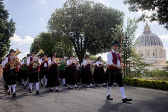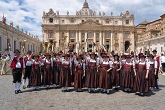 Am Sonntag galt es bereits nach einem frühen Frühstück den Bus zu beladen und die Einlasskontrollen zum Vatikan zu absolvieren, denn um 9 Uhr begann der Gottesdienst zum Hochfest Fronleichnam in der Kirche des Campo Santo Teutonico. Da nun eine weitere Musikkapelle aus Österreich dazugestoßen ist und alle Musiker zu einer großen Kapelle zusammengefügt wurden ergab sich ein Orchester aus über 130 Musikanten. Die Prozession führte am Petersdom entlang und durch die Vatikanischen Gärten stetig ansteigend zur Lourdes-Grotte hinauf. Die Mühen und Anstrengungen beim gemeinsamen Marschieren wurden mit tollen Ausblicken auf den Petersdom und das römische Stadtzentrum belohnt. Nach einer kurzen Andacht führte ein etwas kürzerer, dafür deutlich steilerer Weg zurück zu einem Innenhof zwischen Petersdom und Campo Santo. Hier endete nach einer ebenfalls kurzen Andacht die liturgische Fronleichnamsfeier.