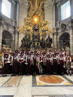 Nachmittags stand ein weiteres Highlight auf dem Programm. Die Fronleichnamsfeierlichkeiten sollten mit einer Messe im Petersdom, am Hochaltar über dem Grab des Heiligen Petrus begonnen werden. Nach einer gemeinsamen Probe mit einer Kapelle aus Baden-Württemberg und einem Bläserensemble aus Österreich erfolgte der feierliche Einzug mit klingendem Spiel und beobachtet von zahlreichen Besuchern in den Petersdom. Zelebriert wurde die Messe vom Rektor des Campo Santo Teutonico, Pfarrer Konrad Maria Bestle, der aus dem Landkreis Günzburg stammt. Das Gefühl, an einem der heiligsten Orte der katholischen Kirche musizieren zu dürfen war überwältigend! Aufgrund der Nähe der Unterkunft zum Petersplatz konnte dieser auch noch in den späten Abendstunden besucht werden und der beleuchtete Platz sowie der Petersdom entfaltete eine ganz besondere Stimmung.