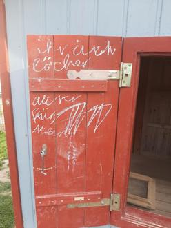 Desweiteren wurde eine Spielzeugtruhe sowie Zaunlatten beschädigt. Und auch diverse Schmierereien an unserem Gartenhaus mussten wir feststellen.
