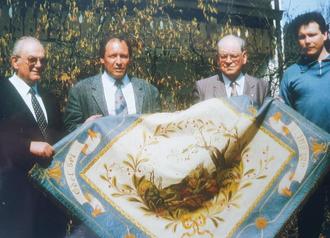 Ostersonntag 1996: Nach 51 Jahren kehrt die Fahne nach Haldenwang zurück. Von links: Pfarrer Konrad Meisburger, Bürgermeister Anton Klotz, Hauptlehrer i.R. und Ehrenbürger Josef Welle sowie der US-Bürger Richard Steinmeier, Neffe des US-Soldaten, der die Fahne aus Haldenwang mitgenommen hat.