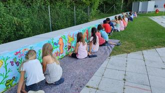 Wir, die Schulkinder der Klassen 2a und 4a der Grundschule Haldenwang brachten diese bunte Unterwasserwelt ans Tageslicht, direkt auf die angrenzende Betonmauer.