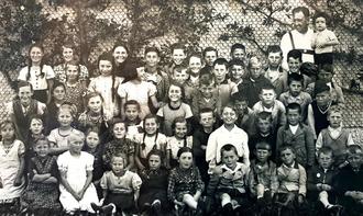 Börwanger Schulkinder im Jahr 1937 mit Lehrer Josef Grünbauer (1936-1945). Auf dessen Arm Sohn Fred Grünbauer.