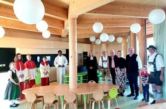 Mit Ministranten und Kindern trafen sich im lichtdurchfluteten Speisesaal von rechts: Bürgermeister Josef Wölfle, Altbürgermeister Anton Klotz, die stellv. Kindergartenleiterin Karin Gabler, zweiter und dritter Bürgermeister Mathias Amann und Michael Hauke, Pfarrerin Andrea Krakau und Pater Maria Prakash Joseph.