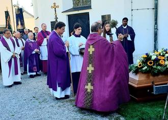 Abschied von Pfarrer Konrad Meisburger in Durach: Im Beisein zahlreicher Priester und einer großen Zahl von Pfarrangehörigen aus Haldenwang und Durach erteilt Dekan Bernhard Hesse den Segen am Priestergrab. Im Hintergrund Weihbischof Florian Wörner.