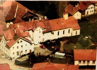 Eine Luftaufnahme aus den 60er Jahren. Im Vordergrund das Kloster mit Kirche und Kindergarten, im Hintergrund rechts das ehemalige Anwesen von Franz-Josef und Kreszentia Prestel. Das Haus wurde 1981 abgebrochen und auf dem Grundstück das Pfarrheim gebaut.