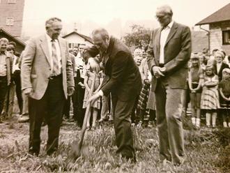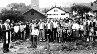 1982: Pfarrer Konrad Meisburger (links) segnet das Baugrundstück vor dem Spatenstich. Mit dabei sind Bürgermeister und Gemeinderäte, Kirchenverwaltung, Mitglieder der Kolpingsfamilie und Interessierte Bürgerinnen und Bürger.