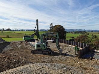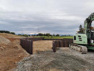 Zur Vergrößerung des Retentionsvolumens wurde das Regenrückhaltebecken mit einer Spundwand umschlossen. Die Sohle wird noch flächenmäßig abgegraben.