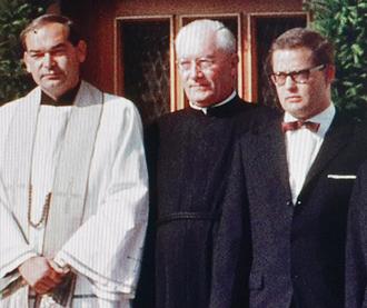 1967: Bürgermeister Max Fackler beim Empfang des neuen Pfarrers Heribert Steiner. In der Mitte Pater Arthur Ogger, Börwang.