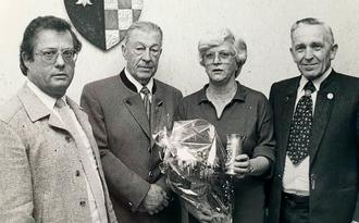 1989: Die langjährige Gemeindeangestellte Pepi Steinhauser (1944-1989) wird von Bürgermeister Josef Zimmer (1976-1990) in den Ruhestand verabschiedet. Mit dabei die ehemaligen Bürgermeister Max Fackler (1965-1976) und Ferdinand Wittköpper (1948-1956).