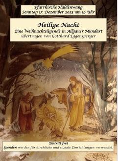 Zum Abschluss des Festjahres „10 Jahre Heimathaus in Börwang“ laden wir am Sonntag, dem 17. Dezember um 19 Uhr mit der Weihnachtslegende „Heilige Nacht“ zu einer besinnlichen Stunde in die Pfarrkirche Haldenwang ein.