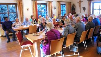 Am 04.02.2025 fand im Pfarrheim in Börwang ein lustiger Seniorennachmittag statt, der vom Seniorenteam der Pfarrgemeinde Haldenwang organisiert wurde. Im vollbesetzten Saal wurde gesungen, geschunkelt, geklatscht, getanzt, gelacht und die Stimmung war einfach toll, eben eine fröhliche Faschingsgaudi. Ein abwechslungsreiches Programm gestaltete der Akkordeonspieler Gerd Antoni aus Börwang mit alten Schlagern und Liedern, Gstanzln (ausgesungen wurden u.a. Bürgermeister Wölfle, der Gemeinderat und der anwesende Pater Prakash) Witze sowie Liedersketche wie „Schönheitsauswahl“ (Oh wie bist du schön / wiascht) und einer „Welturaufführung“ (Ganz Börwang träumt von der Liebe, denn dort ist sie ja zu Haus – nicht in Paris!!!). Helga Müller (wer sonst!) loste jedem Besucher einen Tanzpartner zu; die anschließende Tanzrunde heizte die Stimmung nochmal kräftig an. Die Frauen vom Seniorenteam versorgten die Teilnehmer flink und gekonnt mit Kaffee und Krapfen usw. Danke! So waren die lustigen Stunden zu schnell vergangen, und alle Besucher waren voll des Lobes und waren sich einig: Dieser Nachmittag hat Lebenslust und Lebensfreude für alle Anwesenden („länger Junggebliebenen“) erzeugt und einfach froh gestimmt.