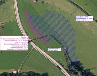 Langfristig sinnvoll ist es jedoch für den Schutz des Ortes auch die Teilgebiete 1 und 3 zu betrachten. Als Lösung dafür bietet sich die Errichtung eines Hochwasserdamms an der Kreisstraße OA 12 Richtung Wildpoldsried an. Der Damm ist an seiner höchsten Stelle lediglich 2,05 Meter hoch und läuft nach Norden und Süden gegen „Null“ aus. Bei einer Böschungsneigung von 1:7 ist die Fläche zudem landwirtschaftlich weiter gut bewirtschaftbar und fügt sich in die Landschaft ein.