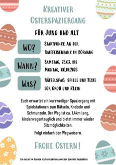 Auch in Untrasried gibt es einen Osterspaziergang – beide Wege sind in Kooperation entstanden. Start ist das Gemeindehaus in Untrasried. Die Stationen sind hier von Sonntag, 29.03.2026 bis Mittwoch, 08.04.2026 aufgebaut.