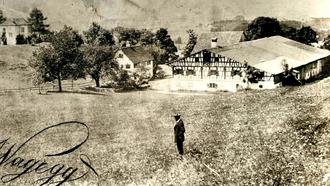 Die Ökonomie des ehemaligen Schlosses Wagegg, abgebrochen 1908. Im Nebengebäude links (ehemals Waschküche) stellte Franz Schelbert 1810 den ersten Hartkäse nach Schweizer Art her.