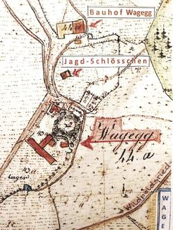 Kartenausschnitt der fürstäbtlichen Liegenschaften zu Wagegg mit Burgruine und Schloss, Jagdschlösschen und Ökonomie (Bauhof) an der Wegekurve Richtung Fleschützen.