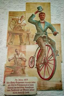 Georg Guggenmos auf seinem mit Hilfe von Schmied und Wagner selbstgebauten Hochrad. Das Gemälde befindet sich an der Hauswand des Anwesens Knestele in Haldenwang, Hauptstraße 6, und wurde von seinem Enkel, Malermeister Georg Knestele, gefertigt.