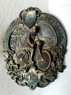 „ALL HEIL“ ist auf der Mitgliedsplakette des Veloziped-Clubs Haldenwang eingeprägt. Das Abzeichen konnte man ans Revers stecken.