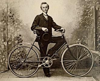 Verzeichnis der Gemeindebehörde Haldenwang über die ausgestellten Fahrradkarten von 1907 bis 1911. In der Mitte finden wir u.a. den Eintrag 328 vom 29. Juni 1908: „Fritz Herb, Installationshelfer, Haldenwang“. Das Bild rechts zeigt den Radfahrer Fritz Herb (Bruder von Ernst Herb und dem späteren Bürgermeister Georg Herb). Fritz Herb ist 1918 kurz vor dem Ende des ersten Weltkrieg gefallen.