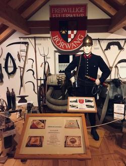 Zum Foto: Der riesige Feuerwehrmann mit seinem Schlauchwagen und dem Strahlrohr in der Hand steht im Dachgeschoss unseres Heimathauses.- Ein toller Blickfang, den uns die „Freiwillige Feuerwehr Börwang" zur Verfügung gestellt hat. Er will bestaunt werden! Foto: HK