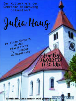 Der Kulturkreis der Gemeinde Haldenwang präsentiert Julia Haug zu einem Konzert in der Pfarrkirche St. Theodor in Haldenwang am Sonntag, den 26.03.2023 um 17.30 Uhr. Der Eintritt ist frei. Um Spenden wird gebeten.