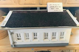 Auf dem Gelände des heutigen Dorfplatzes stand der zweite Kindergarten. Paul hatte in mühevoller Arbeit dieses Modell gefertigt, dass jetzt im Bauernstüble zu bewundern ist.