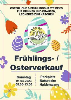 Wir laden herzlichst zu unserem Oster- und Frühlingsverkauf am Samstag 01.04.2023 auf der Freifläche vor der Naturecke Haldenwang ein: viele tolle Dekosachen für drinnen und draußen von unseren Kindern, Jugendlichen und Erwachsenen mit viel Liebe für Sie handgemacht. Auch Leckeres zum Naschen wird es geben!