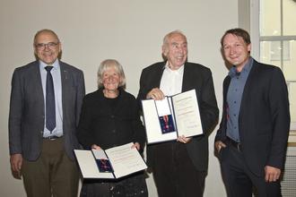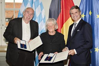 Kempten/ Haldenwang (mor). Schon einmal hatte ein Haldenwanger Bürger eine ähnliche Ehrung erhalten. Jetzt kam die Auszeichnung des Bundesverdienstkreuzes am Bande sozusagen im „Doppelpack“: Konstanze Könning-Egetmeyer und Dr. Karl-Albrecht Egetmeyer wurden beide für ihr Lebenswerk, ihre besonderen Verdienste um die Bundesrepublik Deutschland geehrt. Die Verleihung des Verdienstkreuzes nahm Europaminister Erich Beißwenger im kleinen Saal des gerade wieder eröffneten Kornhauses in Kempten vor. Mit dabei war auch Haldenwangs Bürgermeister Josef Wölfle und Jan Drechsler, Geschäftsführer von HOI! Psychosoziale Hilfsgemeinschaft e.V.. U.a. hatte Drechsler die Ehrung angeregt.