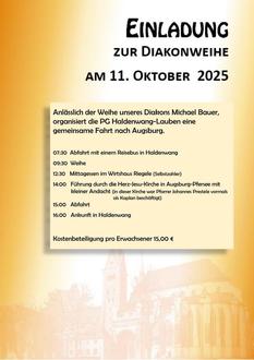 Am 11. Oktober findet die Diakonweihe von unserem Diakon Michael Bauer statt. Die Pfarreiengemeinschaft Haldenwang-Lauben organisiert hierfür eine gemeinsame Fahrt nach Augsburg. (Das Programm entnehmen Sie bitte dem Flyer.)