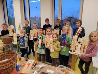 Ein letztes Mal im Jahr 2022 trafen sich Anfang Dezember 13 Kinder zum Basteln im Werkraum der Grundschule. Diesmal stand eine Deko aus Holz auf dem Programm. Auf drei vorbereiteten Holztafeln durfte jedes Kind ein winterliches oder weihnachtliches Motiv malen. Mit Acrylfarben malten sie klassische Bilder wie Schneemann, Tannenbaum und Vogelhäuschen, aber auch Wichtel und Elche waren beliebte Motive. Die Holztafeln wurden dann noch auf ein Bodenbrett gesteckt und fertig war das Dekoteil.