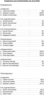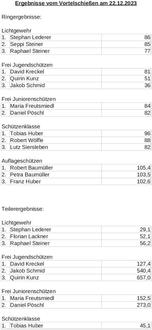 Daniel Pöschl gewann mit einem 143,7 Teiler die Weihnachtsscheibe der Jugend. Tobias Huber siegte bei den Erwachsenen mit einem 24,0 Teiler. Bei den Senioren sicherte sich Robert Baumüller mit einem 9,4 Teiler die Weihnachtsscheibe.
