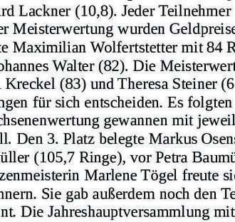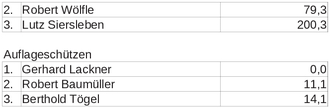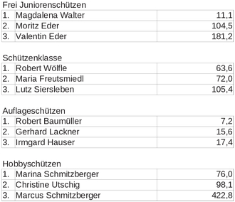 Erwachsenenwertung gewannen mit jeweils 95 und 92 ringgleich Tobias Huber und Andreas Schroll. Den 3. Platz belegte Markus Osenstätter (93). Die Seniorenwertung gewann Robert Baumüller (105,7 Ringe), vor Petra Baumüller (103,8) und Sven Wagner (103,0).