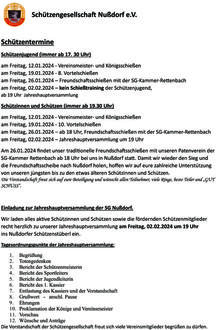 Wir laden alles aktive Schützinnen und Schützen sowie die fördernden Schützenmitglieder recht herzlich zu unserer Jahreshauptversammlung am Freitag, 02.02.2024 um 19 Uhr ins Nußdorfer Schützenstüberl ein.