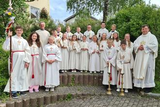 Beim Festgottesdienst sprachen die Kinder, die alle in Alben gekleidet waren, Gebete, den Lobpreis und die Fürbitten, vor allem dafür, dass die Brücke zu Gott Sicherheit und Halt schenke und die Verbindung zu Gott erhalten bleibt. Musikalisch gestaltet wurde der Gottesdienst von Stephan Wahl, unterstützt von einer Instrumentalgruppe. Zusammen mit seiner Frau Karin hatte Wahl das Lied „Du kommst her zu mir“ speziell für Erstkommunion komponiert. Zum Abschluss gratulierten die Gottesdienstbesucher den Kindern mit einem kräftigen Applaus zur Erstkommunion. Der Festtag endete mit einer abendlichen Dankandacht in der Pfarrkirche St. Laurentius.