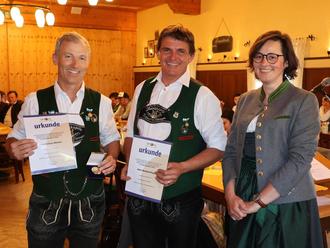 Nußdorf. Hohe Auszeichnung für Andreas Wimmer und Bernhard Posch: Bei der Jahreshauptversammlung der Musikkapelle Nußdorf wurden die beiden Vorsitzenden mit der Verdienstmedaille in Gold ausgezeichnet. Die Ehrungen wurden in Ankerkennung der hervorragenden Verdienste um die bayerische Blasmusik vom Musikbund von Ober- und Niederbayern verliehen. Wimmer, 1. Vorsitzender der Musikkapelle Nußdorf, engagiert sich seit mehr als 30 Jahren in verantwortlicher Position, seit 1994 in der Jugendarbeit der Blaskapelle Traunwalchen und seit der Gründung 2012 als Vereinschef des Nußdorfer Musikverein. Auch Bernhard Posch war von 1994 bis 2008 ebenfalls für die Blaskapelle Traunwalchen und in der Jugendarbeit tätig; seit 2012 ist er stellvertretender Vorsitzender der Musikkapelle Nußdorf. Die Verdienstmedaille mit Ehrenurkunde überreichte Maria Kalsperger von der Vorstandschaft des Musikbundes im Bezirk Chiem- und Rupertigau.