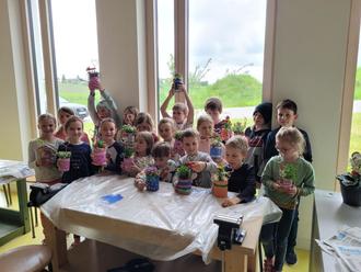 Am Freitag vor Muttertag bastelten wir ein Geschenk für die Mamas. Dazu bemalte die Kinder eine leere Konservendose und konnten diese dann noch mit Klebebändern und anderen Bastelmaterialien verzieren. In die Dose wurden dann eine blühende Pflanze gepflanzt. Ein Herz aus Perlen als Pflanzenstecker dazu und fertig war ein schönes Muttertagsgeschenk.