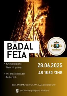 Das „Bädalfeia“ – die Peter- und Paulfeier, veranstaltet vom Burschenverein Nußdorf, findet am Samstag, 28. Juni ab 18.30 Uhr auf dem Kirchenparkplatz an der Pfarrkirche St. Laurentius statt.
