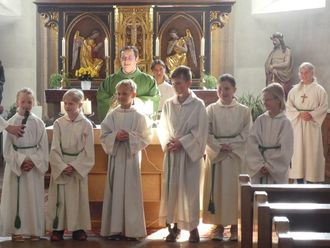 Den Gottesdienst am Sonntag in der Nußdorfer Pfarrkirche St. Laurentius, begann Pater Gabriel-Anton Ferent mit den Worten, dass dieser Gottesdienst ein „kommen und gehen“ sei. Er begrüßte die sechs neuen Ministranten und hieß sie herzlich willkommen. Nachdem sie die mit Weihwasser gesegneten Kreuze umgehängt bekamen, sprachen die neuen Minis zusammen ein Gebet. Das Kreuz steht als Zeichen zur Bereitschaft zum Dienst für Jesus Christus. In seiner Predigt ging Pater Gabriel-Anton Ferent auf die Aufgaben der Ministranten ein und betonte wie wichtig die Ministranten nicht nur im Gottesdienst, sondern auch für die gesamte Gemeinde sind. Er bemerkte dass wir wieder spüren müssen, dass wir einander brauchen und auch Verantwortung für andere übernehmen dürfen. Dies sollte nicht nur als Pflicht verstanden werden, es darf auch Spaß machen. Am Ende des Gottesdienstes verabschiedete er elf Ministranten, die ihren Dienst nun beendeten. Dies waren Rosa Brunner und Christoph Schauer die mit 12 bzw. 11 Jahren am längsten als Ministranten tätig waren, sowie Antonia Posch, Moritz Eder, Sebastian Brunner, Leo Hallweger, Lydia Eser, Nikolas Kleinert, Simon Klaus, Elia Bock und Eva Reich. Er überreichte allen elf ausgeschiedenen Ministranten eine Urkunde und ein kleines Geschenk als Dank für ihren Dienst in der Kirche.