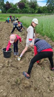 Anschließend liefen sie auf den Kartoffelacker unterhalb des Hofes. Dort pflanzten sie fleißig Kartoffeln ein. Das war ganz schön anstrengend, machte aber auch großen Spaß!