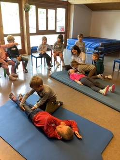 Auch dieses Jahr fand für die Vorschulkinder des Nußdorfer Kindergartens wieder ein Ersthelferkurs statt. Die Kinder übten mit einer ehrenamtlichen Mitarbeiterin des BRK, wie sie helfen können, wenn kleine Unfälle passieren. Sie lernten, Hilfe zu holen, die Notrufnummer 112 und wie man kleinere Verletzungen verbindet oder kühlt. Außerdem konnten sie die stabile Seitenlage üben. Um eine Wunde steril und sauber versorgen zu können, durften alle den Umgang mit Verbandmaterial ausprobieren und üben. Sie erfuhren auch, dass es ganz wichtig ist, den Verletzten zu trösten und nicht alleine zu lassen. Alle Kinder machten bei dem Kurs eifrig mit!