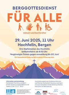 Veranstalter: Erzbischöfliches Ordinariat der Erzdiözese München und Freising. Weitere Informationen zum Berggottesdienst für ALLE über Tel. 089-21372857.