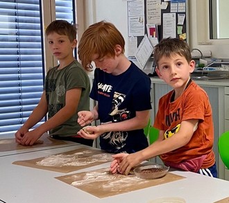 Am 3. Juli bekam die Klasse dann Besuch in der Schule. Die Dorfbäuerinnen Frau Eder und Frau Posch brachten alles Nötige mit, um den Schülern mit viel Geduld das Thema Getreide näher zu bringen. Zunächst erfuhren die Kinder, warum Getreide so gesund und wichtig ist und wie ein Korn im Inneren aussieht. Jeder durfte die Ähren verschiedener Getreidesorten in die Hand nehmen und befühlen, erleben, wie eine Getreidemühle funktioniert und schließlich sogar selbst Haferflocken quetschen. Bei der Herstellung des Brotteigs aus Weizen- und Dinkelvollkornmehl waren die kleinen Helfer mit Feuereifer beim Abwiegen und Verrühren mit dabei. Schließlich durfte noch jeder aus zwei Portionen Teig eigene Semmeln formen und je nach Geschmack mit verschiedenen Körnern bestreuen. Nach dem Backen wurden die ofenfrischen Semmeln sofort mit der selbst hergestellten Butter von der Vorwoche verzehrt. Lecker!