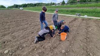 Dort durften wir die Kartoffeln in die vorbereiteten Ritzen setzen, sie mit Erde bedecken und wieder gut feststampfen. Wir waren sogar so schnell, dass wir danach noch die großen Steine vom Acker sammeln konnten.